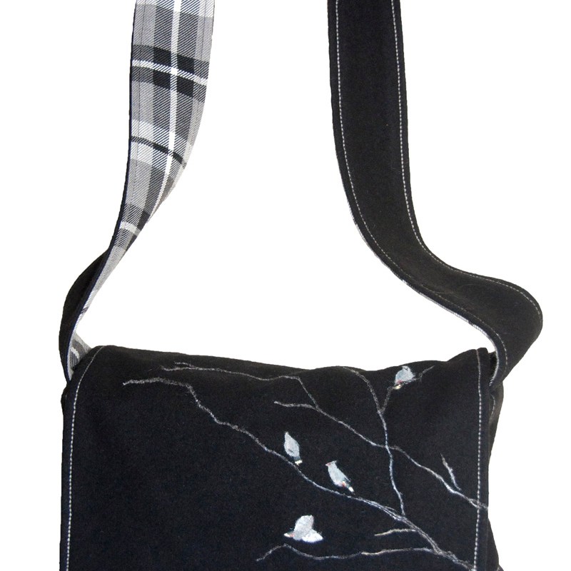 This beige and brown wool bag is great for those days when you need a little extra carrying space. The bottom part of the bag unzips to make the bag 6 inches (15 cm) longer. Closed dimensions of this bag are 12 inches (30 cm) wide, 10 inches (26 cm) high and 3 1/2 inches (9 cm) deep. This bag has one inside zippered pocket measuring 7 inches (18 cm) wide by 4 1/2 inches (12 cm) high. The strap is 43 inches (110 cm) long making it easy to carry the bag across the body. Embellished with a 3 dimensional flower and embroidered leaves. Contact me for information on purchasing. SOLD